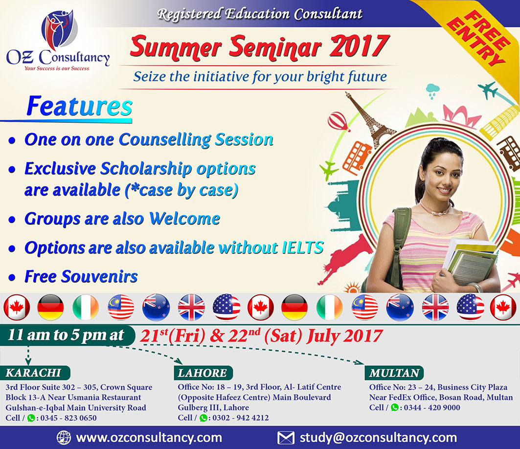 On behalf of our company (OZ Consultancy). We are feeling oblige that we are Organizing Summer Seminar at our Lahore, Karachi, Multan Office.